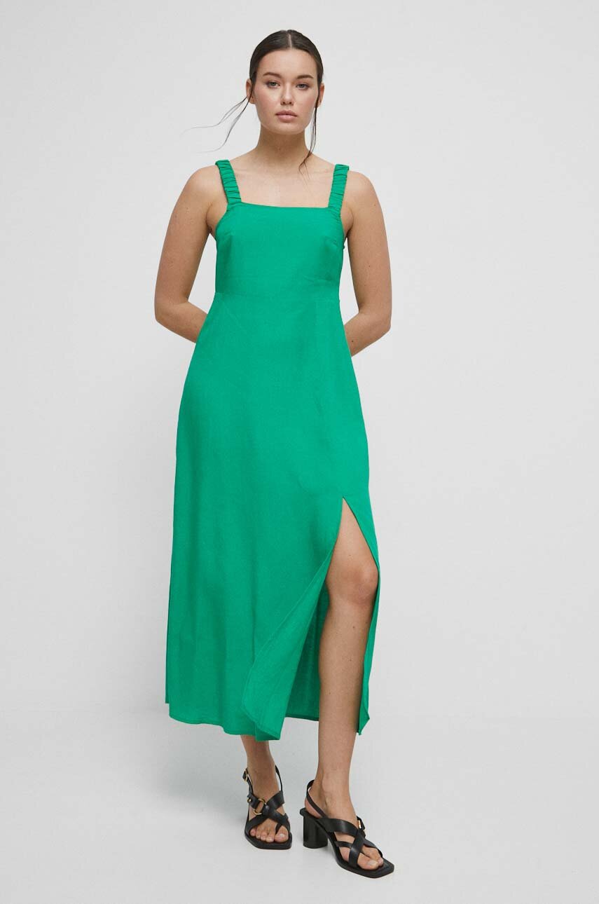 Deși are un aspect elegant, rochia este extrem de practică. Materialul său neted și aerisit asigură o senzație plăcută pe timpul purtării, iar fasonul în clos adaugă un plus de confort, fără a restricționa mișcarea. Este o alegere excelentă pentru zilele fierbinți de vară, când confortul și stilul sunt esențiale.