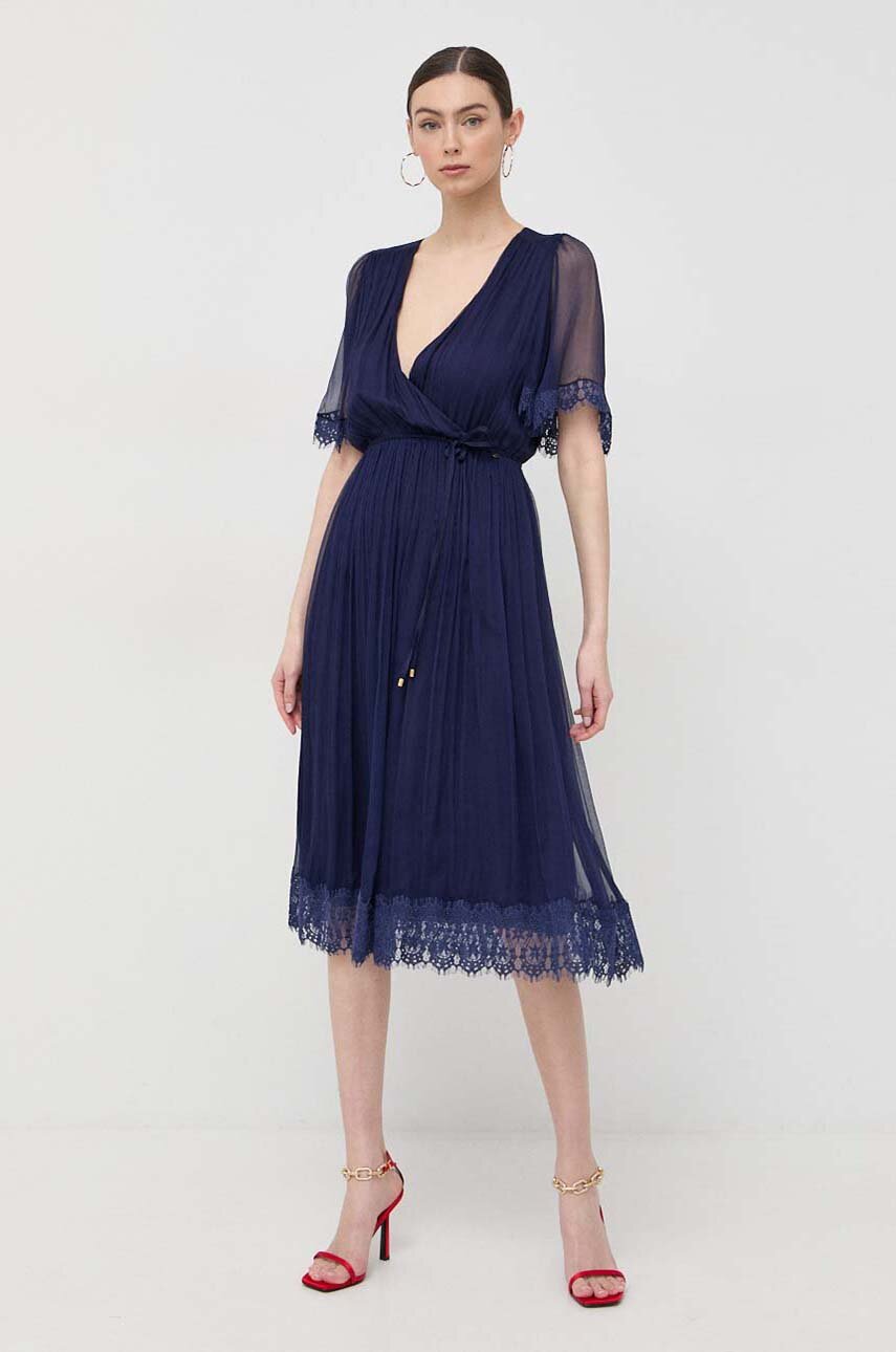 Rochia este disponibilă într-o nuanță de **albastru marin**, o alegere clasică ce se potrivește cu o varietate de accesorii și nuante. Această culoare elegantă poate fi ușor combinată cu sandale sau pantofi stiletto și bijuterii argintii sau aurii, pentru a crea un look complet.